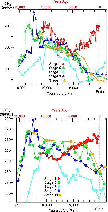 In previous interglaciations, natural CO2 decreases of 35 to 55 ppm occurred soon after peak interglacial warmth. As we’ve seen, after the peak warmth in the Holocene, the CO2 decreased by 7 ppm over 1,500 years and would have continued to get naturally cooler. Instead, the CO2 trend in the Holocene is anomalous by ∼35 ppm.