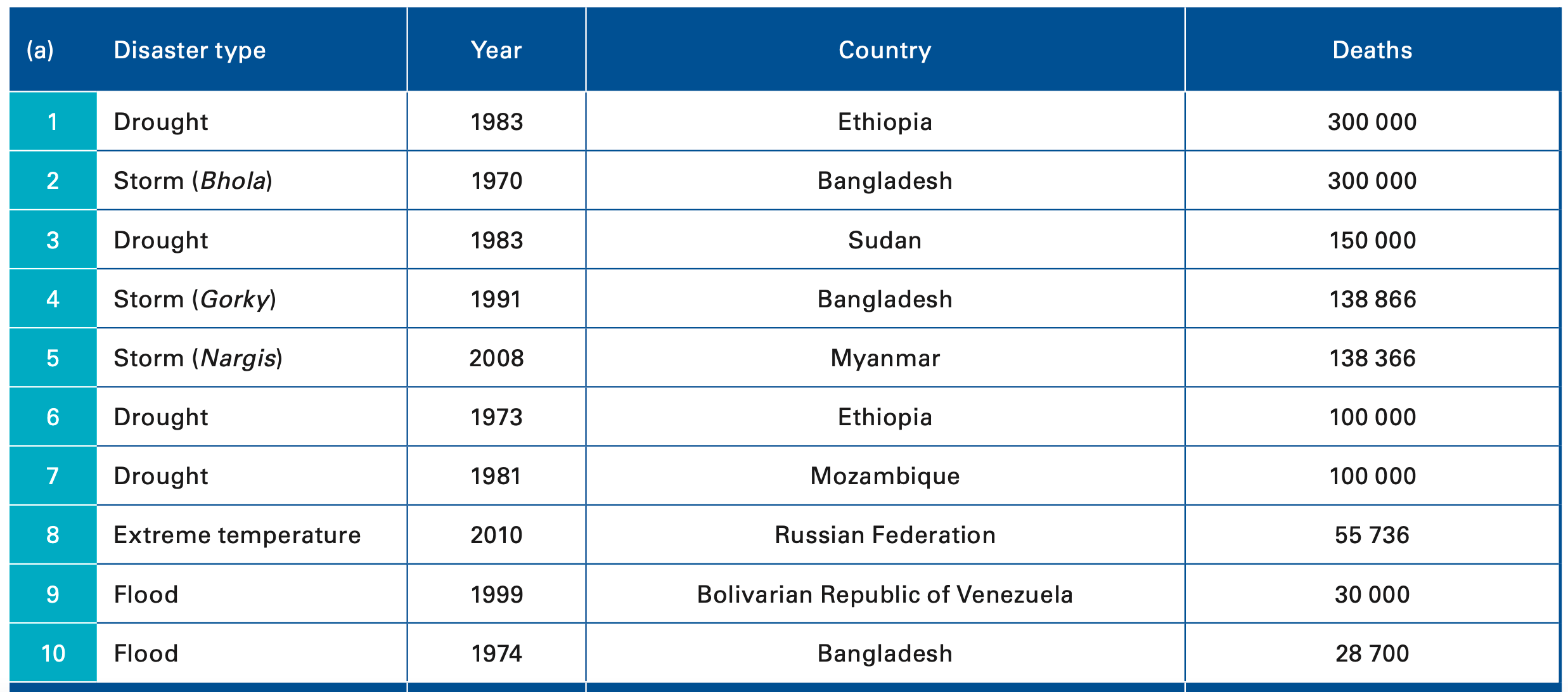 This is a list of the top natural disasters that led to human loss between 1970-2019: