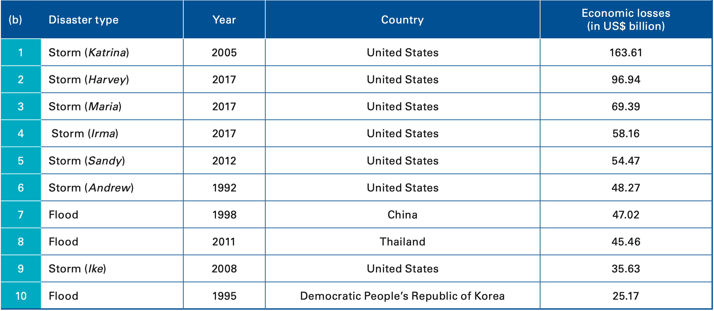 Most costly storms: Hurricanes Harvey (US$ 96.9 billion), Maria (US$ 69.4 billion) and Irma (US$ 58.2 billion)