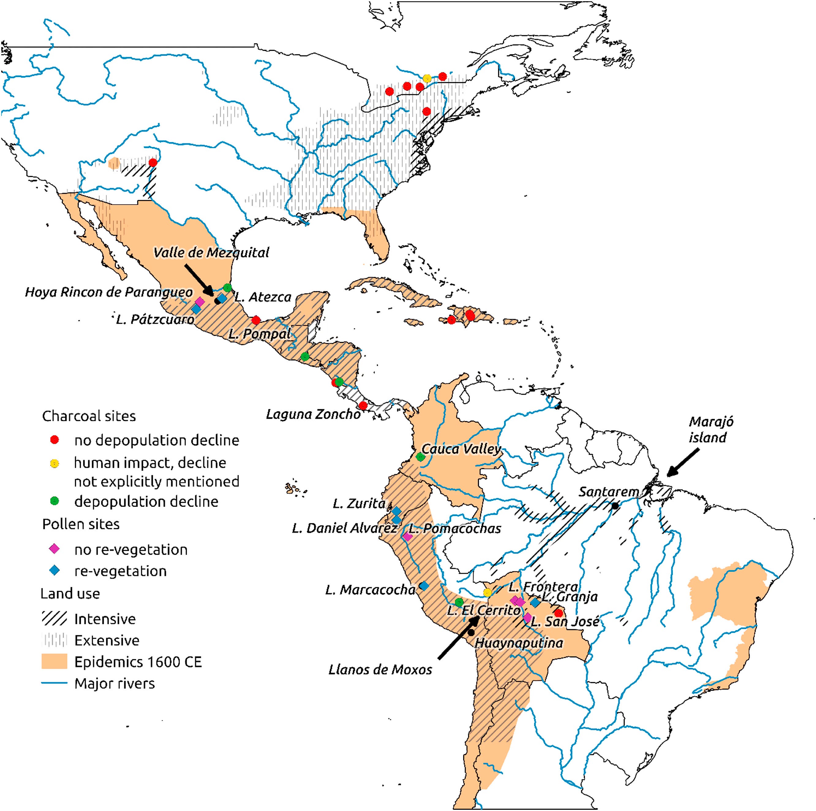 Land use changes: Native populations practiced agriculture on a scale that significantly transformed their environment. Research shows that a pre-Columbian population of 60.5 million would have used 0.5 to 1.5 ha of land per capita. Thus, the death of 55 million people led to the abandonment of approximately 56 million ha of land, which underwent secondary succession, a type of ecological succession in which plants and animals recolonize a habitat after a significant disturbance such as human activity.